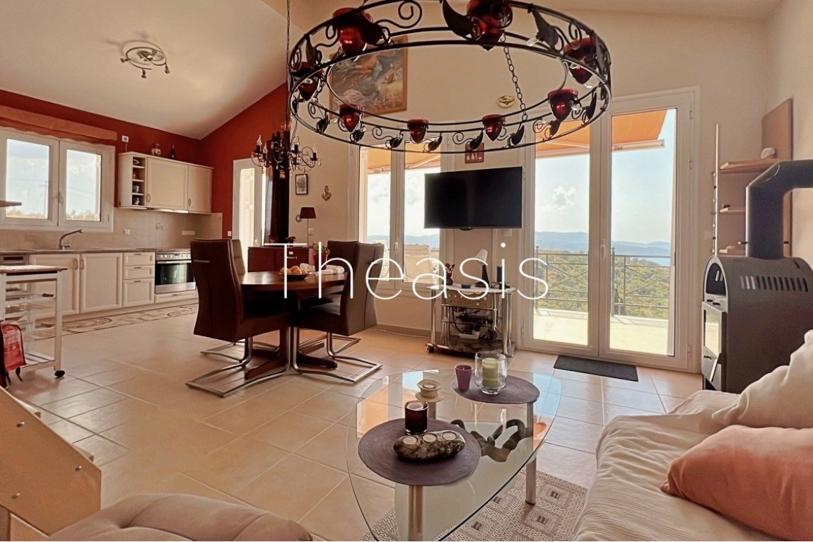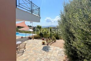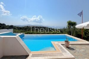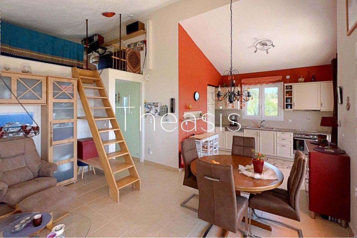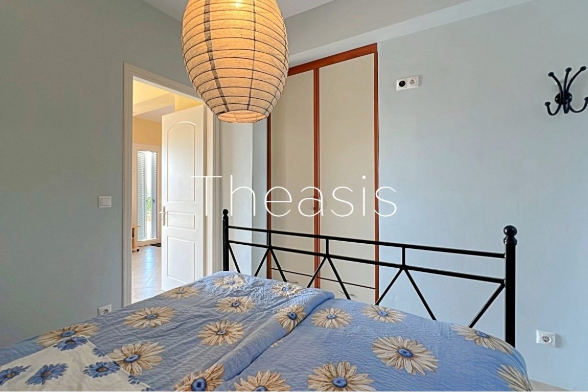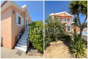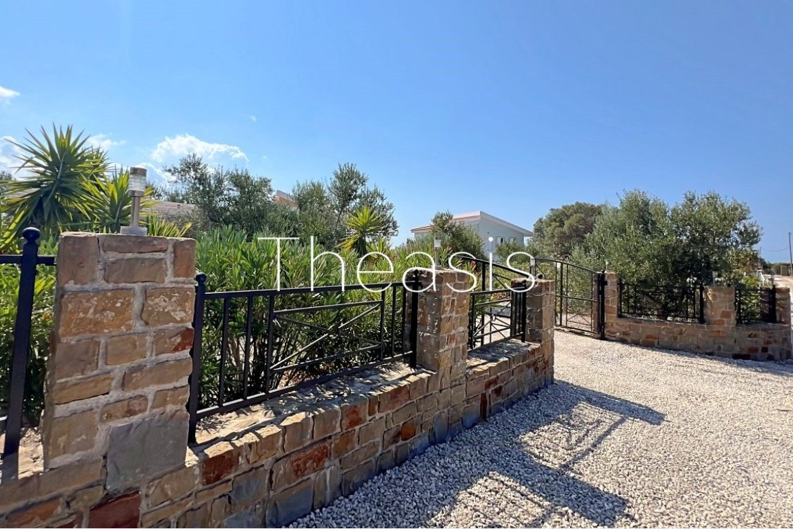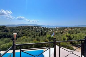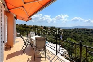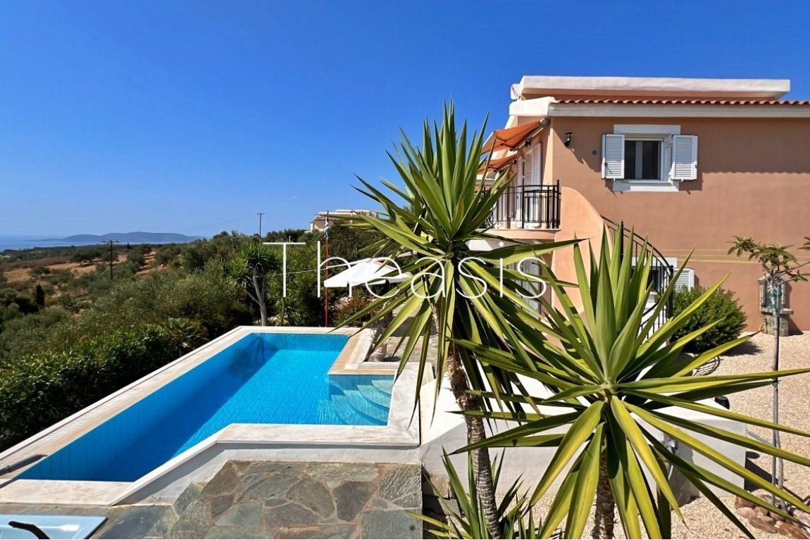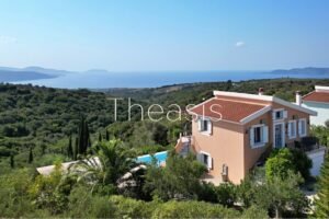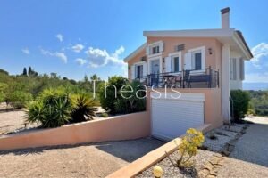 This beautiful house is located on a hillside in walking distance to the traditional village Evangelismos where you will find a mini market and a tavern. The house was built in the years 2006 – 2007 on a plot of 1357,25 m² which is fenced and enjoys stunning unobstructed views to the sea, the islands Schiza, Agia Marina, Sapienza, the green hills and the olive groves of the area.