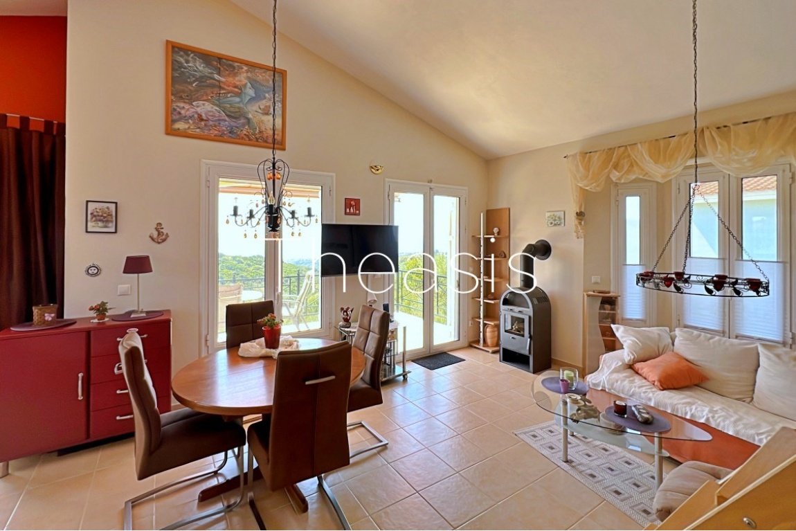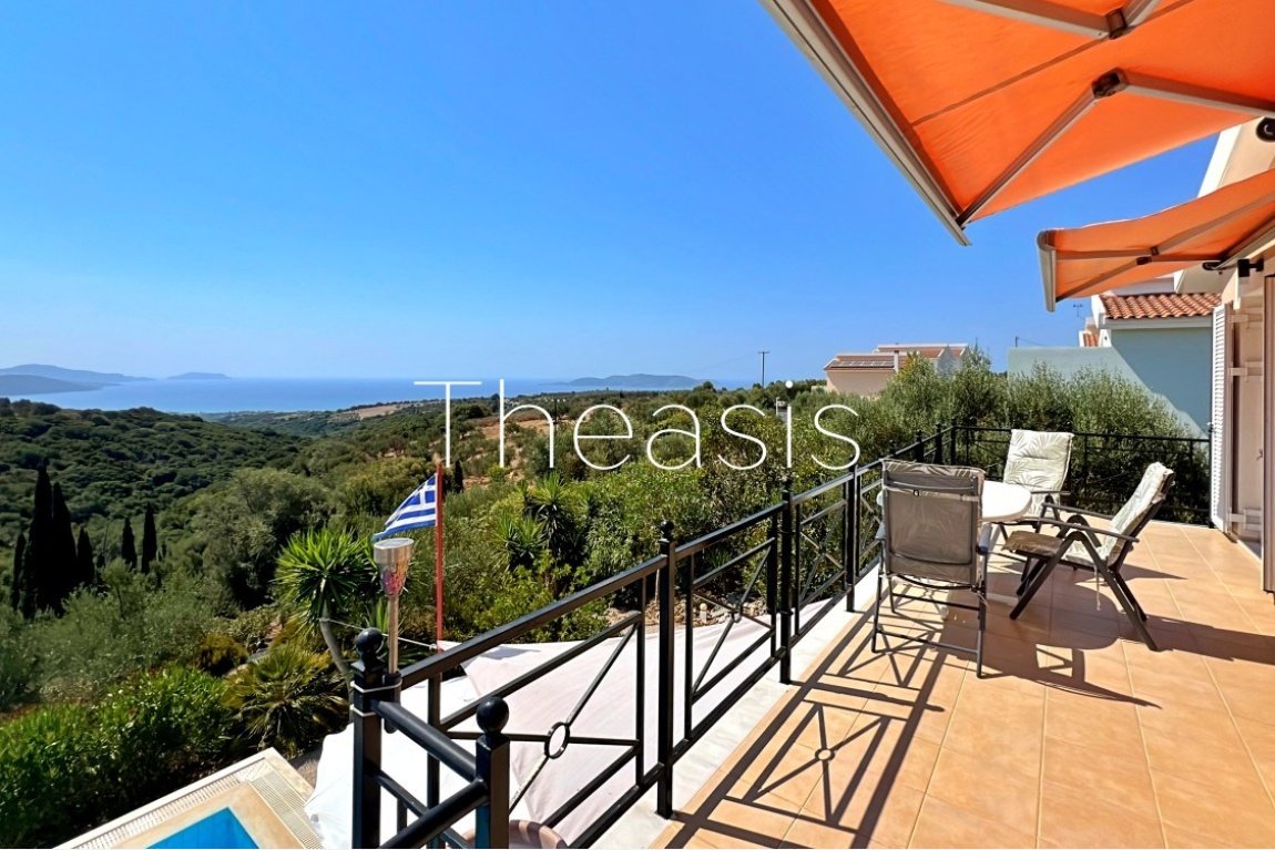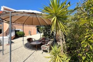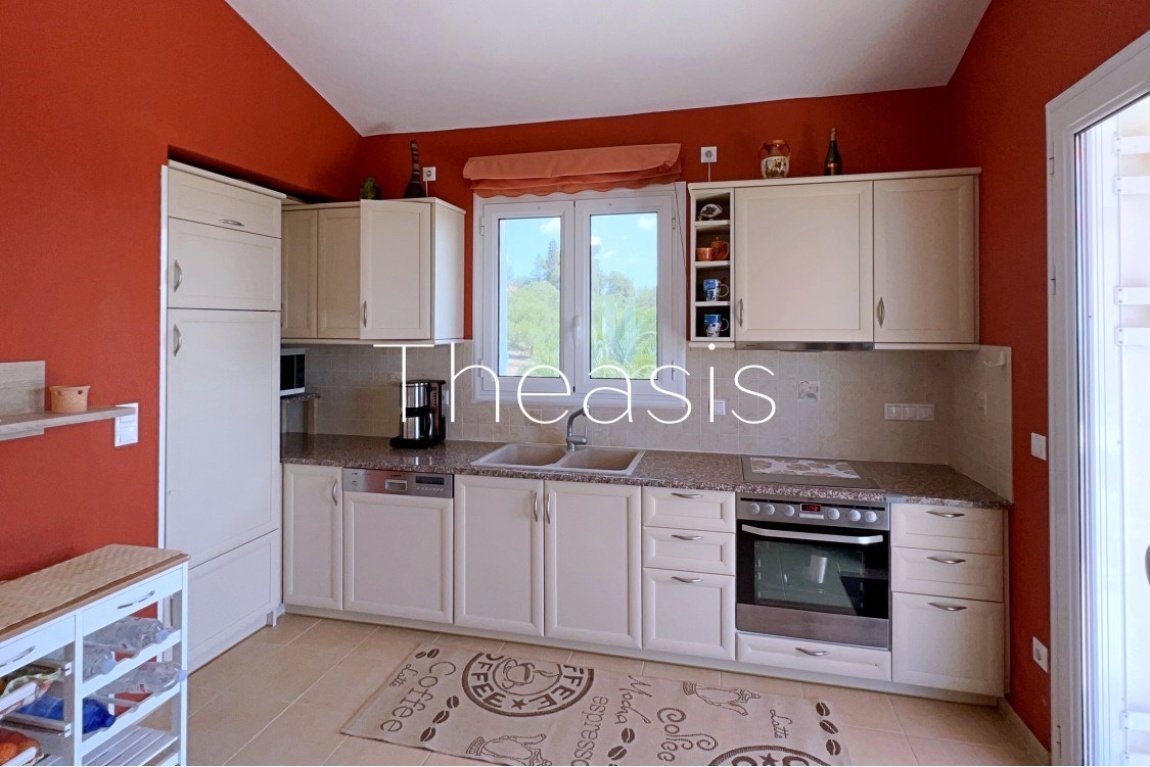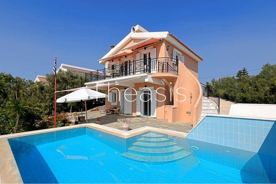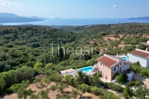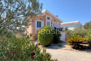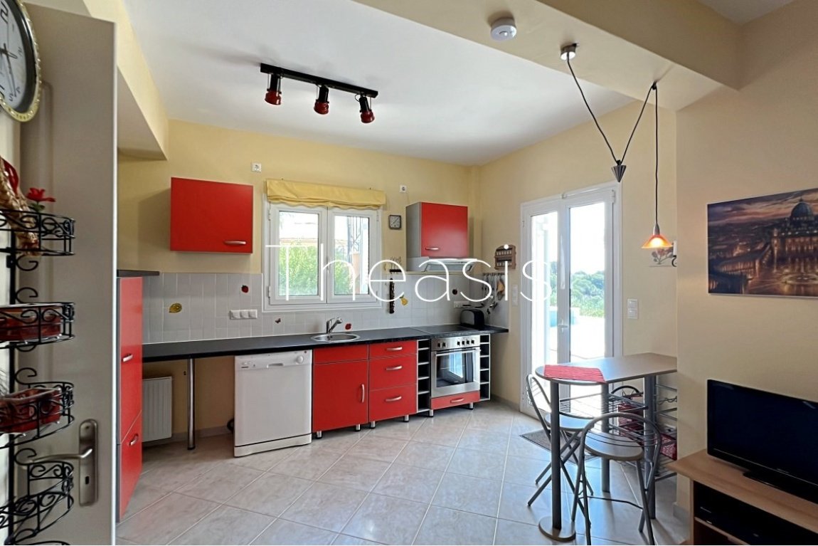 This beautiful house is located on a hillside in walking distance to the traditional village Evangelismos where you will find a mini market and a tavern. The house was built in the years 2006 – 2007 on a plot of 1357,25 m² which is fenced and enjoys stunning unobstructed views to the sea, the islands Schiza, Agia Marina, Sapienza, the green hills and the olive groves of the area.