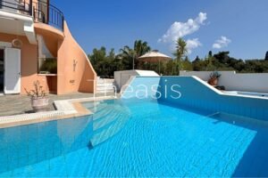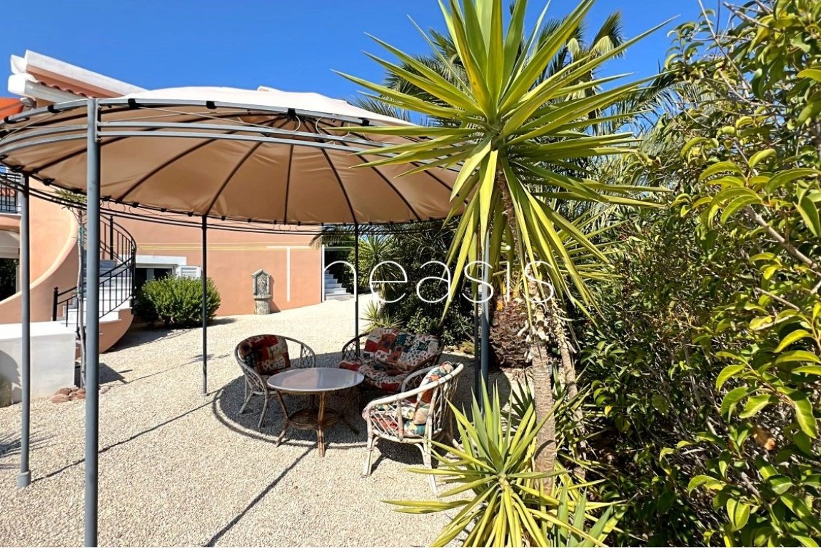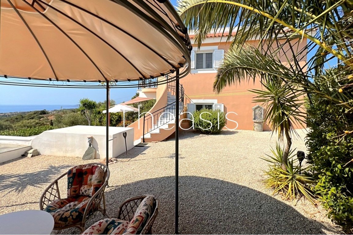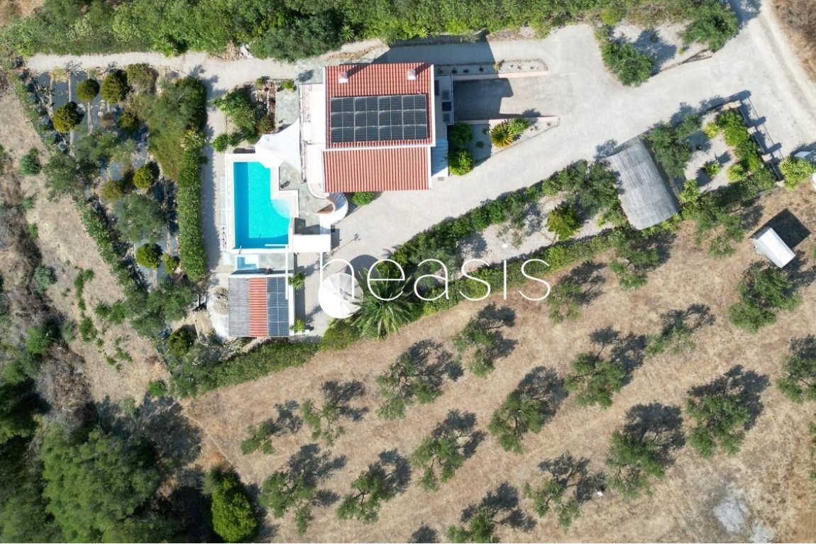 An entry iron gate leads to the parking area and the garden of the back yard. Two side pathways lead to the swimming pool and the terrace with the sun beds and sun umbrellas. The Infinity pool is 32,96 m², tiled with lighting, countercurrent system and waterfall shower, while a jacuzzi is positioned right next to the pool. There is also a heat pump for the pool water and the jacuzzi. The machinery room of the pool is spacious enough to store the necessary chemical products. A storage of 3,98 m² provides space for storing the garden tools. Next to the storage as an extra facility there is a water tank of 2.000 Lt in case of emergency. The elevated garden is planted with productive olive trees bringing high quality olive oil.