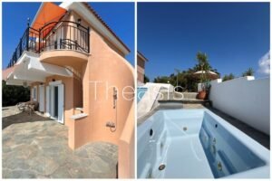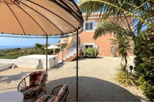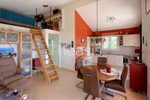 The upper floor has access via an external staircase and consists of an open plan living room with kitchen, bedroom, elevated attic, bathroom and guest toilet. The balcony is spacious enough and enjoys breathtaking views to the sea, the landscape and the swimming pool. A secondary external staircase leads to the pool terrace.