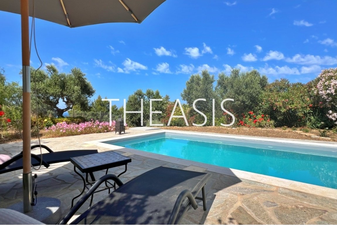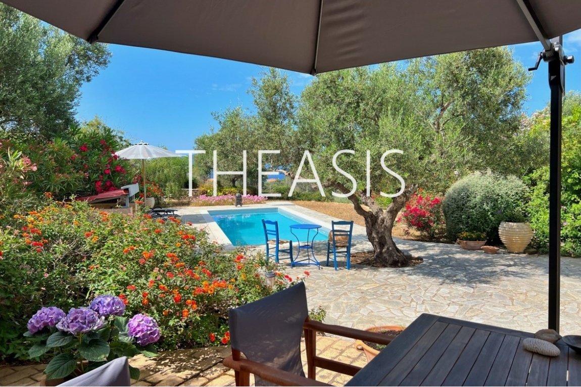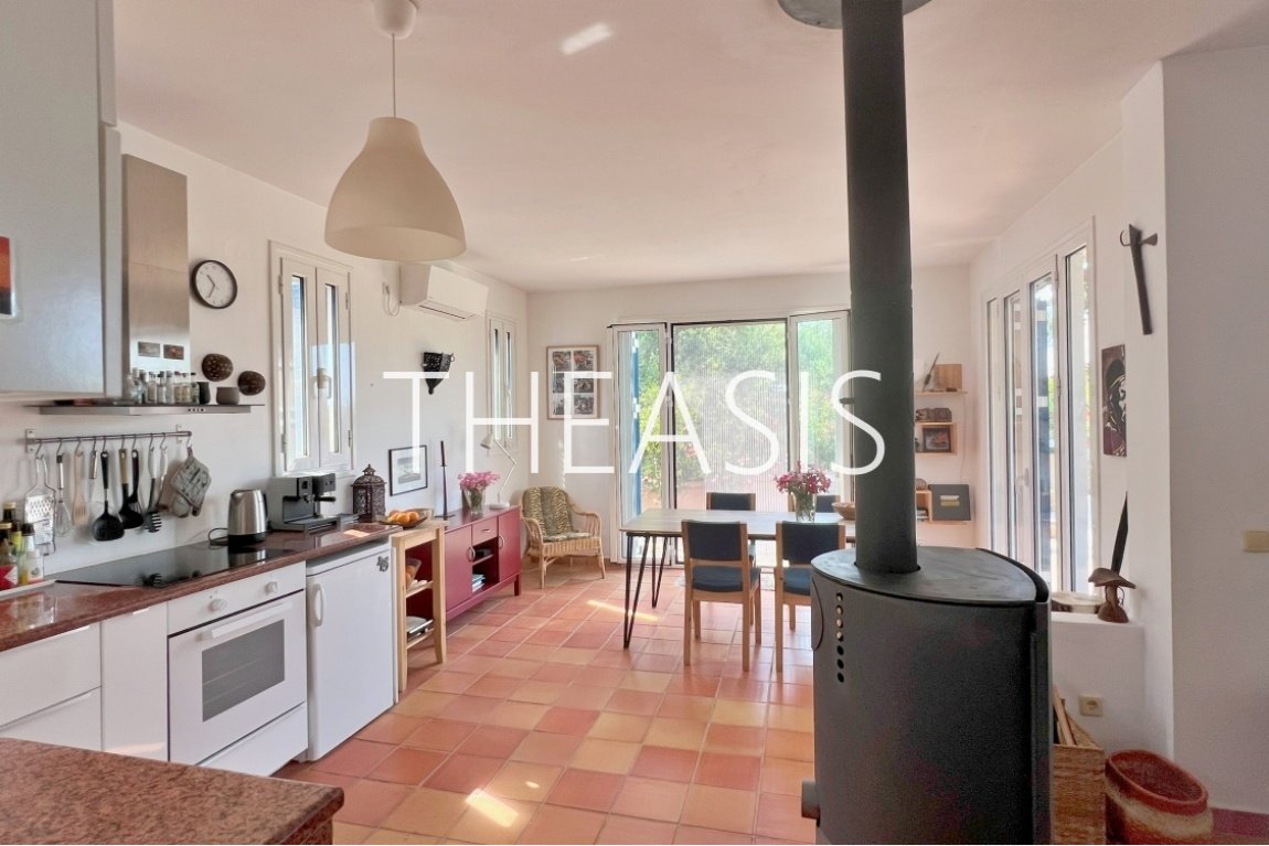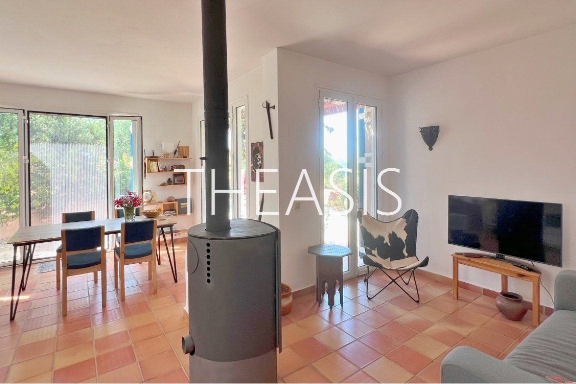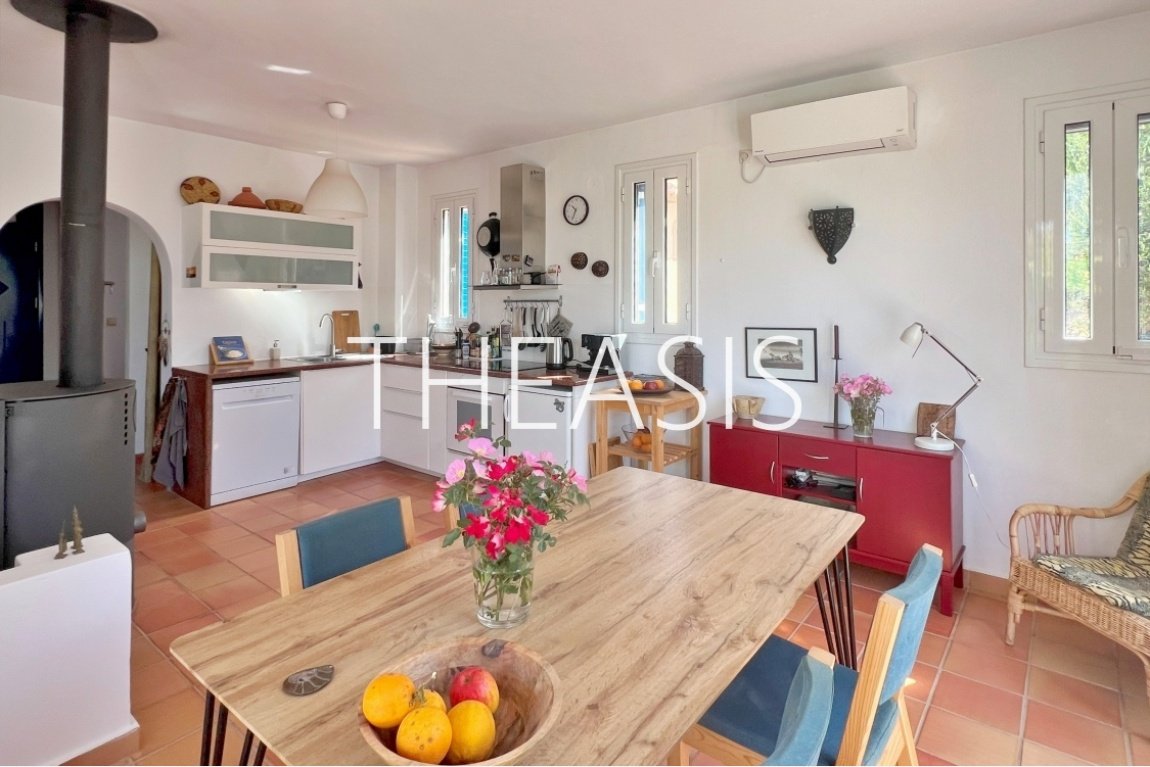 The ground floor features an open-plan living area with a wood burner, a fully equipped kitchen (including dishwasher, freezer, and oven), a dining area, one bedroom, a bathroom with shower, and a utility space beneath the internal staircase. The living room opens directly onto a covered veranda and the beautifully maintained garden. A pergola, lush grape arbor, and inviting swimming pool complete the perfect setting for relaxation and entertaining.