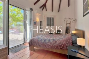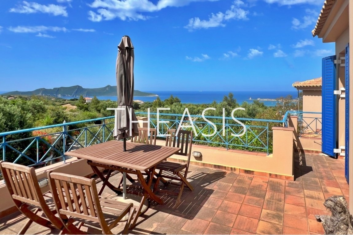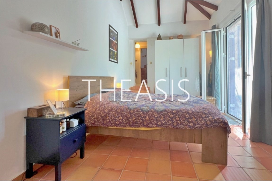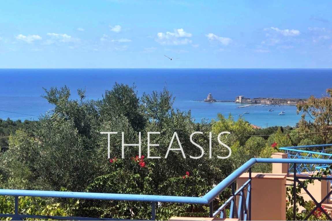 Upstairs, the second bedroom and a bathroom with shower offer comfort and privacy. A standout feature is the expansive upper balcony with uninterrupted panoramic views of the Ionian Sea, Methoni Castle, and breathtaking sunsets.