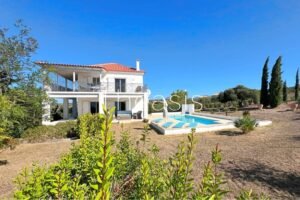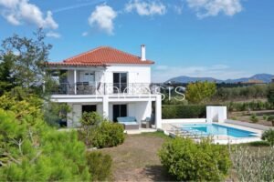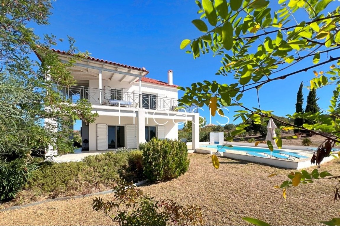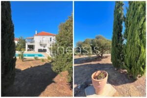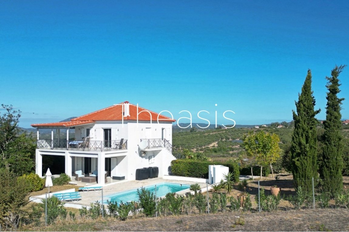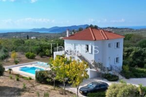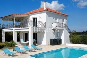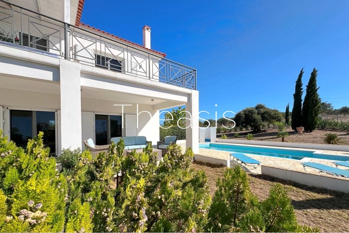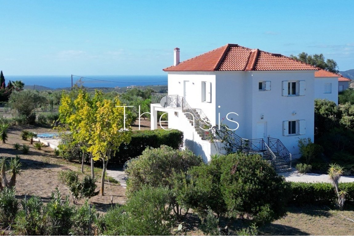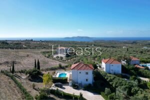 Das Anwesen befindet sich in Evangelismos – Kamaria, einer beliebten Gegend für Ferienhaus- und Villenbesitzer, die natürliche Schönheit mit lokalem Charme verbindet und eine ruhige Umgebung mit vielfältigen Möglichkeiten für Aktivitäten im Freien bietet. Das 5.549 m² große Grundstück bietet einen herrlichen Blick auf das Meer, die Olivenhaine der Umgebung und die Inseln Schiza, Agia Marina und Sapienza. Das bezugsfertige Haus wurde in den Jahren 2009–2010 auf zwei Ebenen mit einer Gesamtfläche von 130 m² erbaut.