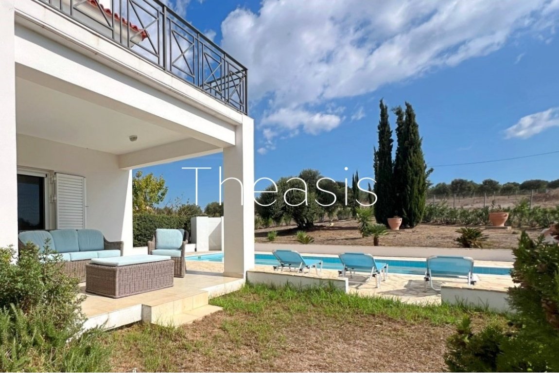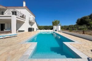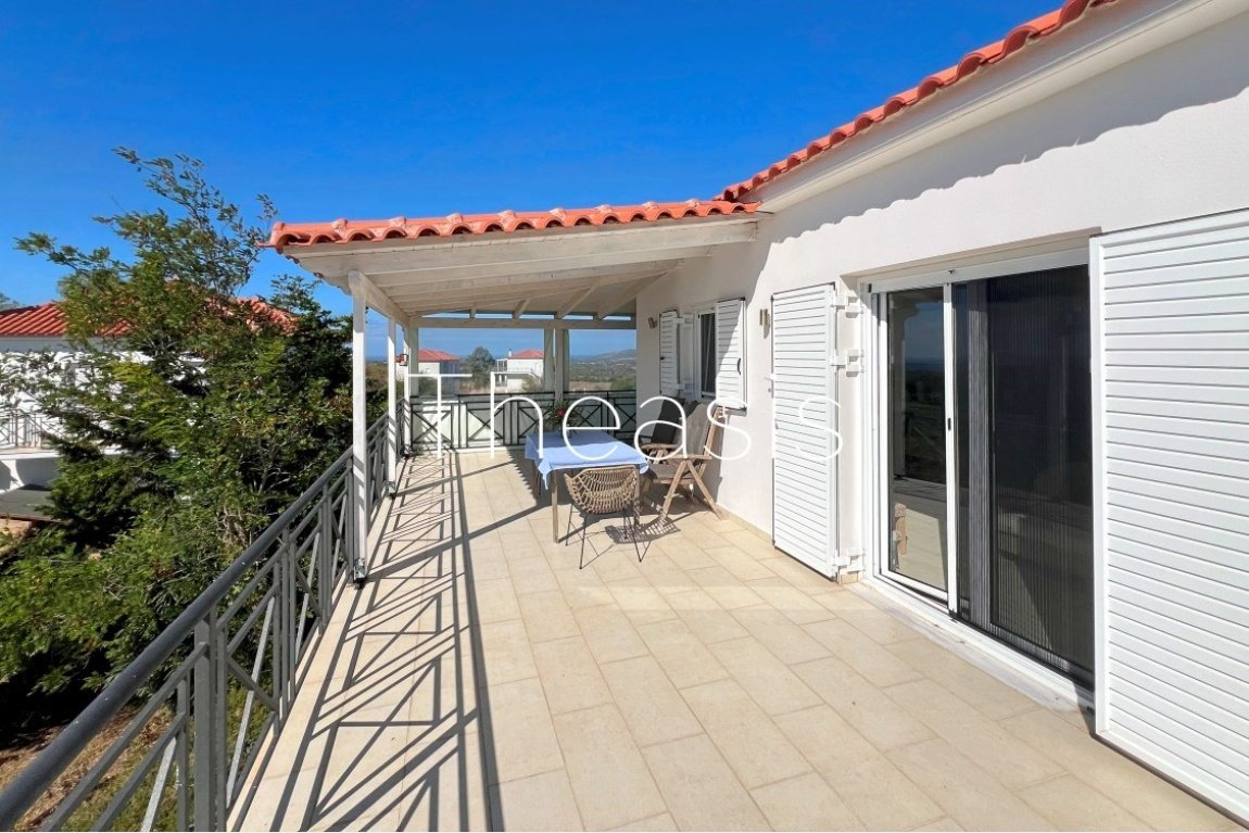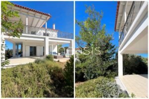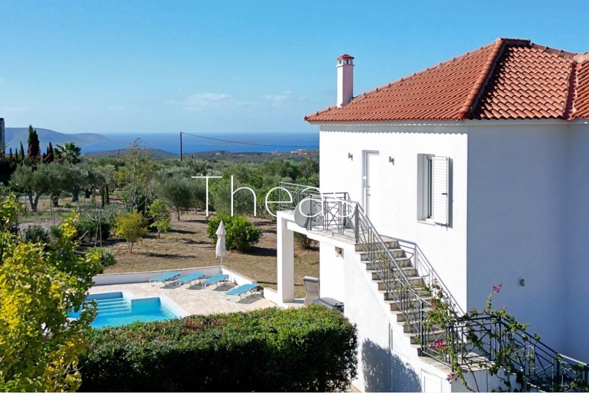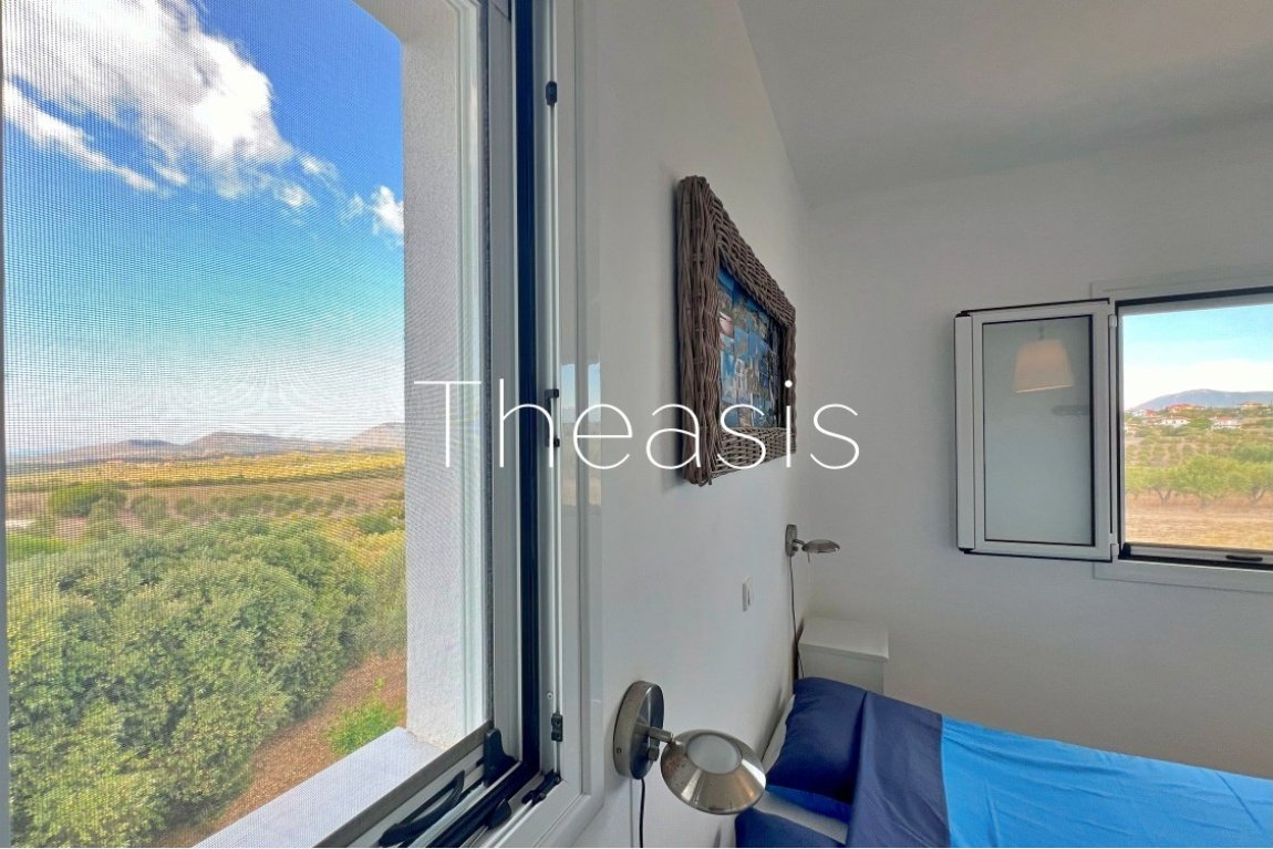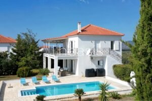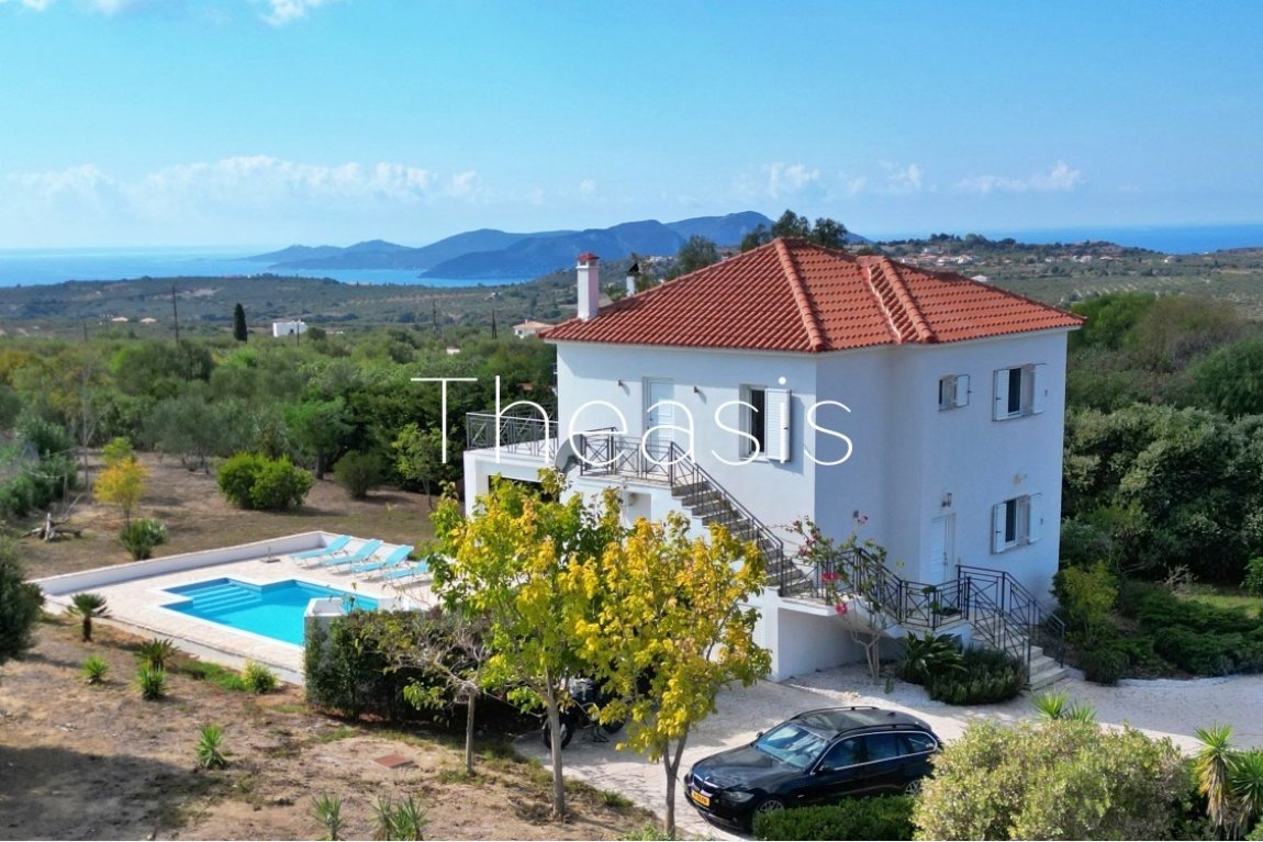 Das Anwesen befindet sich in Evangelismos – Kamaria, einer beliebten Gegend für Ferienhaus- und Villenbesitzer, die natürliche Schönheit mit lokalem Charme verbindet und eine ruhige Umgebung mit vielfältigen Möglichkeiten für Aktivitäten im Freien bietet. Das 5.549 m² große Grundstück bietet einen herrlichen Blick auf das Meer, die Olivenhaine der Umgebung und die Inseln Schiza, Agia Marina und Sapienza. Das bezugsfertige Haus wurde in den Jahren 2009–2010 auf zwei Ebenen mit einer Gesamtfläche von 130 m² erbaut.