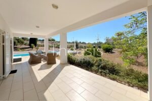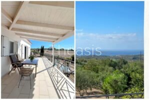 Die geräumige (40 m²) L-förmige Veranda ist mit einer gefliesten Pergola überdacht und bietet einen wunderschönen Blick auf das Meer, den Garten und die Olivenhaine.