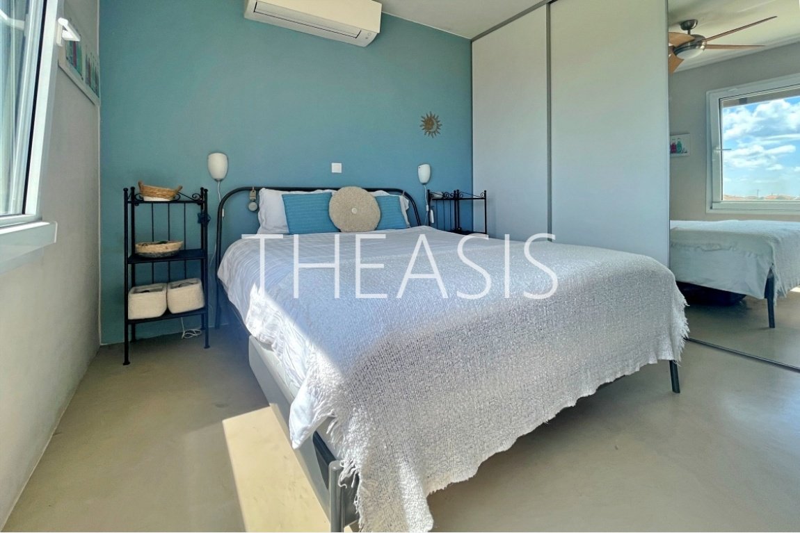 The lower floor of the main apartment includes a bright open-plan dining area, a fully equipped kitchen, and direct access to a sun-drenched terrace and shaded pergola lounge. Upstairs, you'll find a serene bedroom with an en-suite bathroom and a spacious lounge room with panoramic views of the sea and the island of Schiza. The balcony offers the same breathtaking outlook.