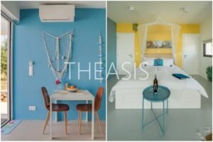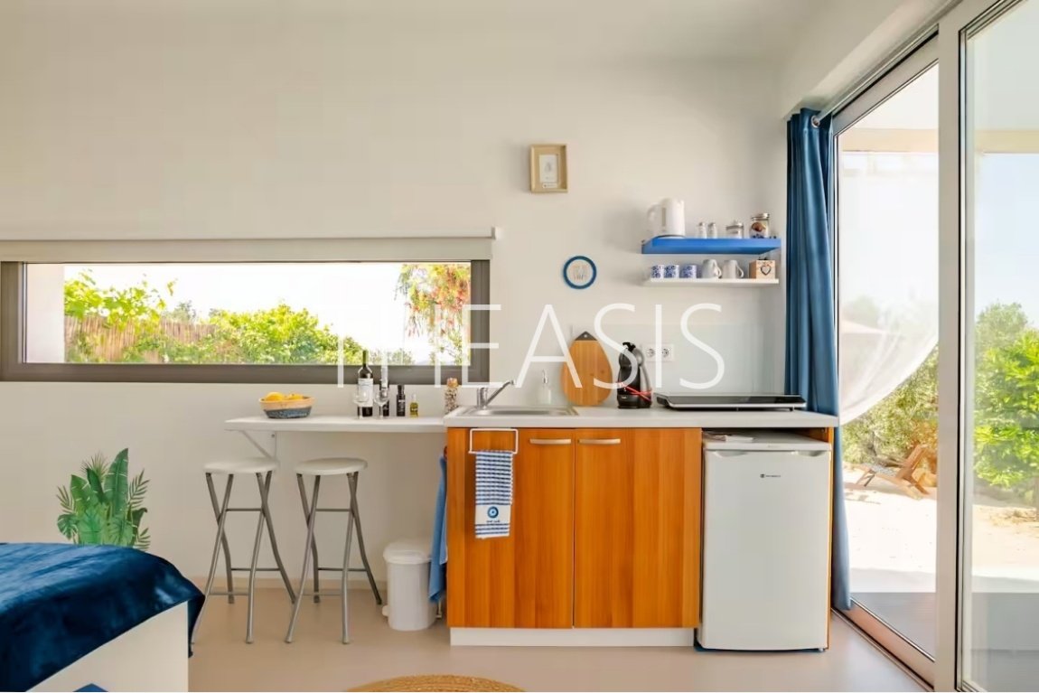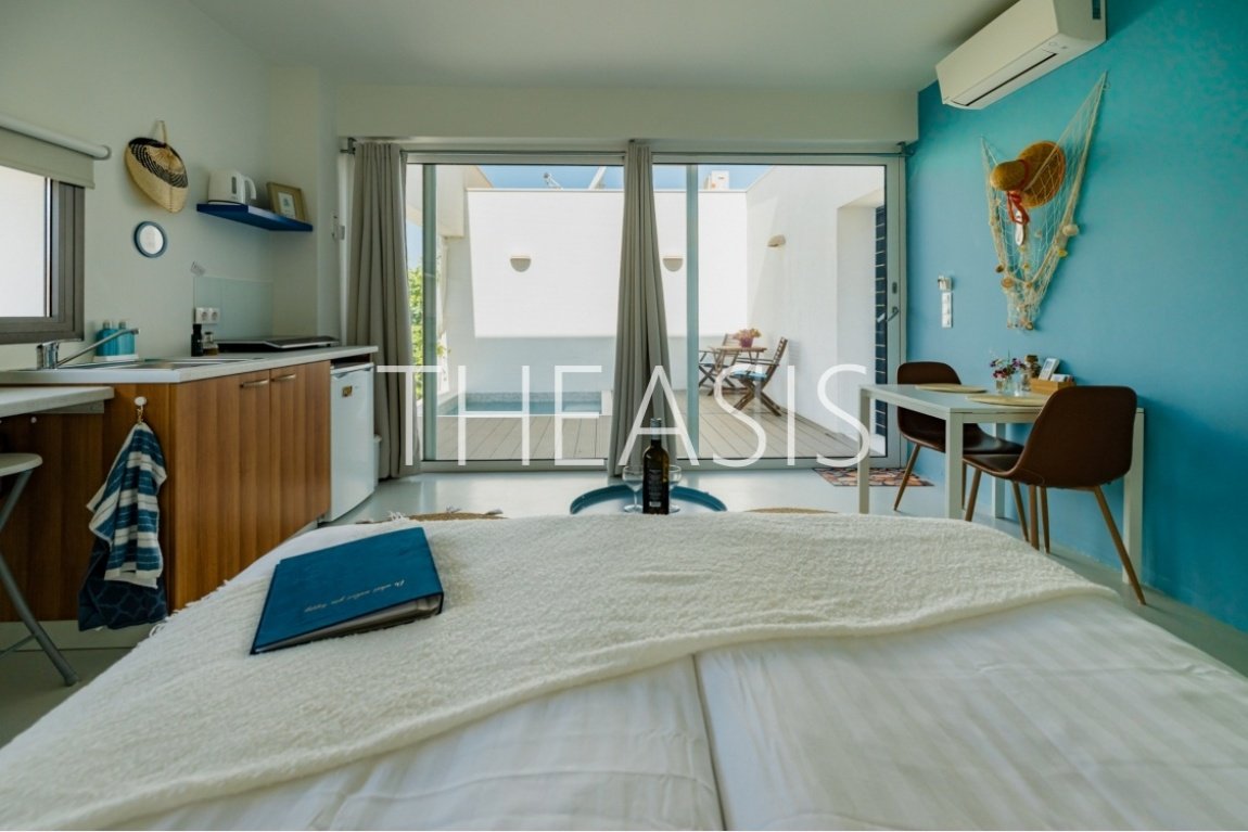 Each studio includes a combined living and sleeping area, a well-equipped kitchenette, a shower room and separate WC and a private patio with a 2.50m x 2.45m plunge pool, accessed through large sliding doors.