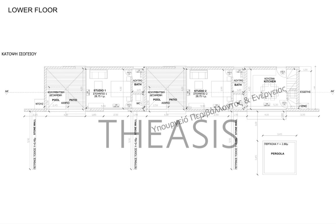 The lower level houses two independent studios, each 28.75 m² (57.50 m² total).