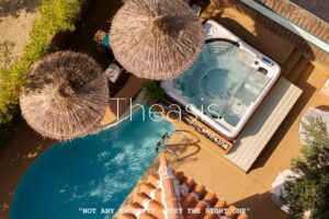 The landscaped garden area offers a small swimming pool, a Jacuzzi and a bar serving refreshments, drinks and light snacks. This pleasant outdoor space provides guests with a relaxing and private environment, ideal for unwinding while still being only a short walk from the vibrant village center.