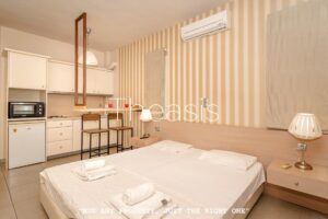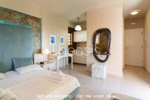 An internal staircase leads to the upper floor, which measures 139.18 m2 and consists of 4 studios (30.79 m2 + 28.75 m2 + 29.46 m2 + 34.71 m2). Each studio includes a double bed, kitchenette, bathroom and a balcony with garden views. One of the studios benefits from a spacious veranda with pergola and a unique outdoor sleeping and dining area, creating an inviting space to relax and enjoy the Mediterranean climate.
