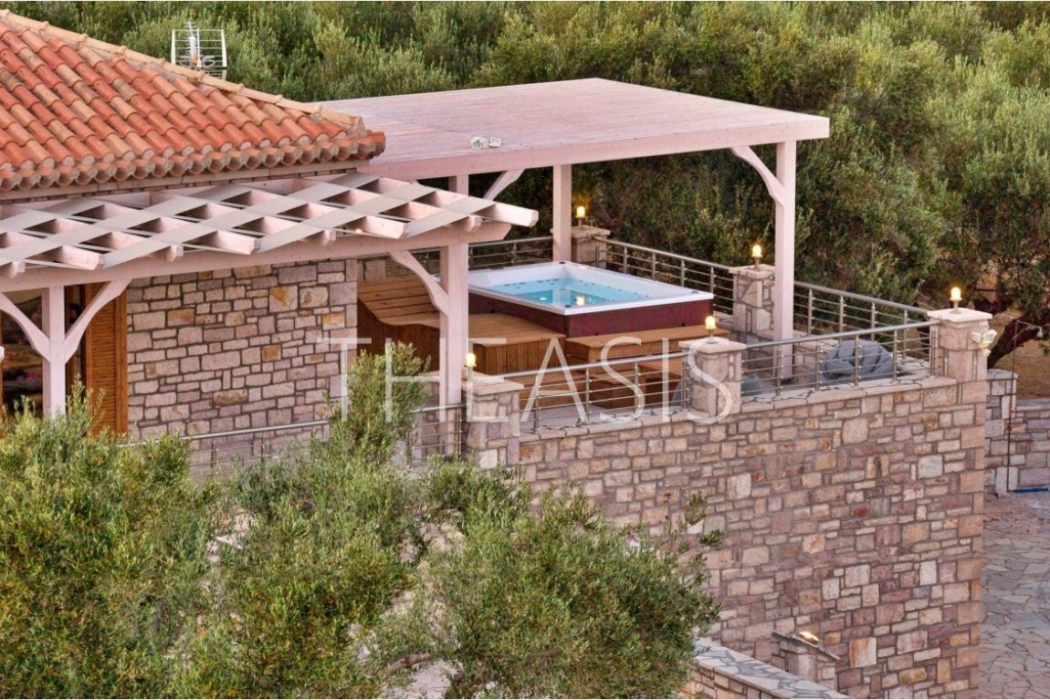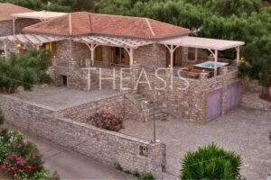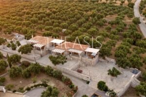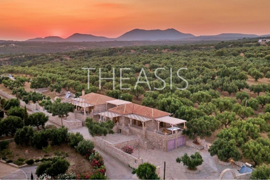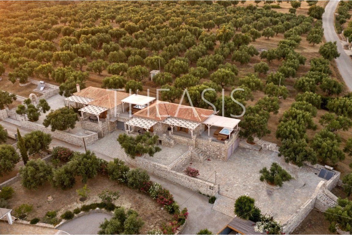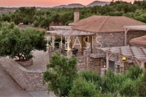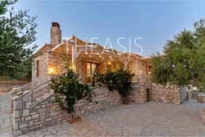 Nestled in the serene countryside of Kamaria – Finikounda, this exceptional stone-built property enjoys a tranquil setting surrounded by elegant residences and picturesque holiday homes. Set on a generous 5,150 m² plot, it offers breathtaking vistas over the azure waters of the Finikounda Gulf, the scattered islands, and the silvery-green olive groves that blanket the landscape.
