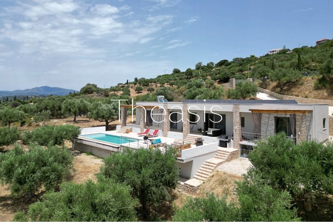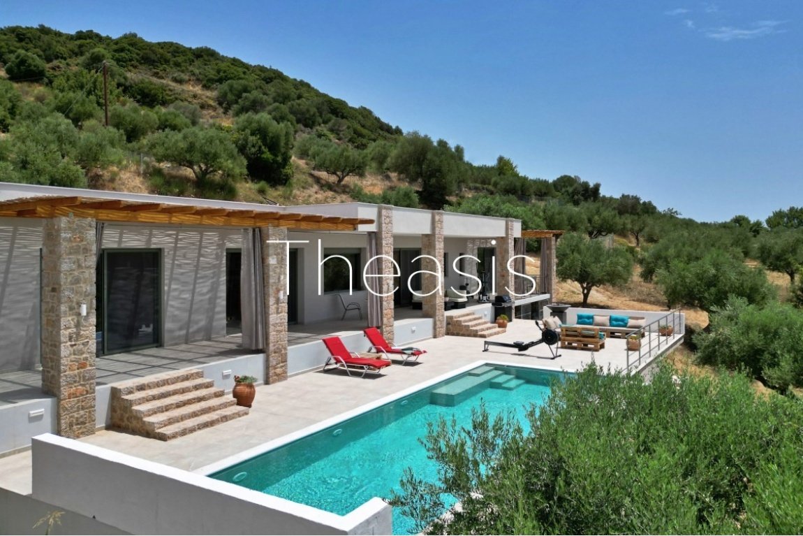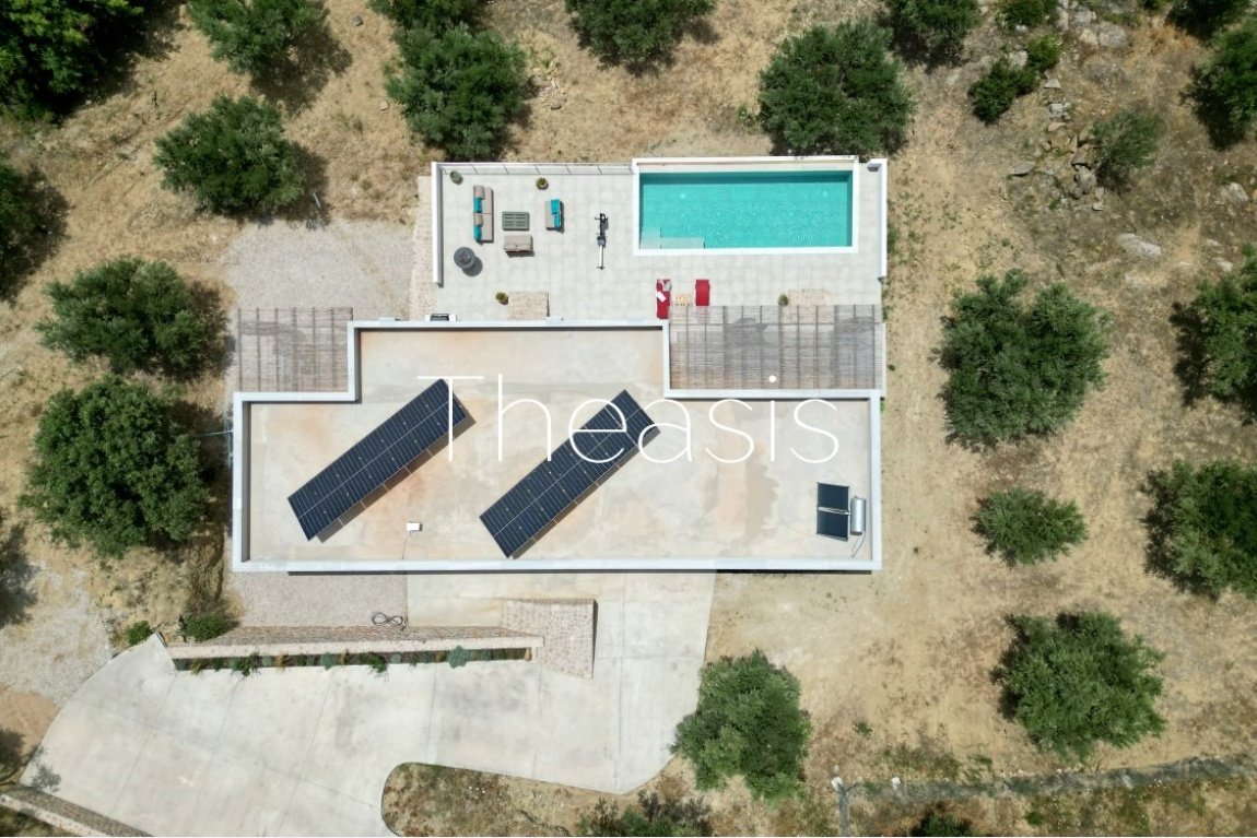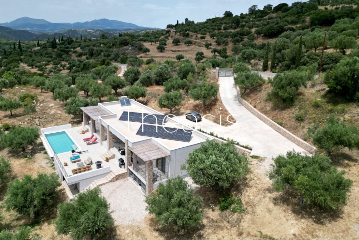 • Property Details: Newly built (2023) villa with stunning sunset, sea and island views, Hillside location in Akritochori – Finikounda area, Plot 5571.95 m² with olive trees, Modern design, Living area 162 m² (182 m² including the walls), 3 Bedrooms, 2 Bathrooms, Storage area, Swimming pool with infinity, Large terraces partly shaded, Easy access.