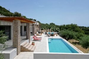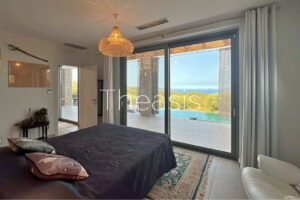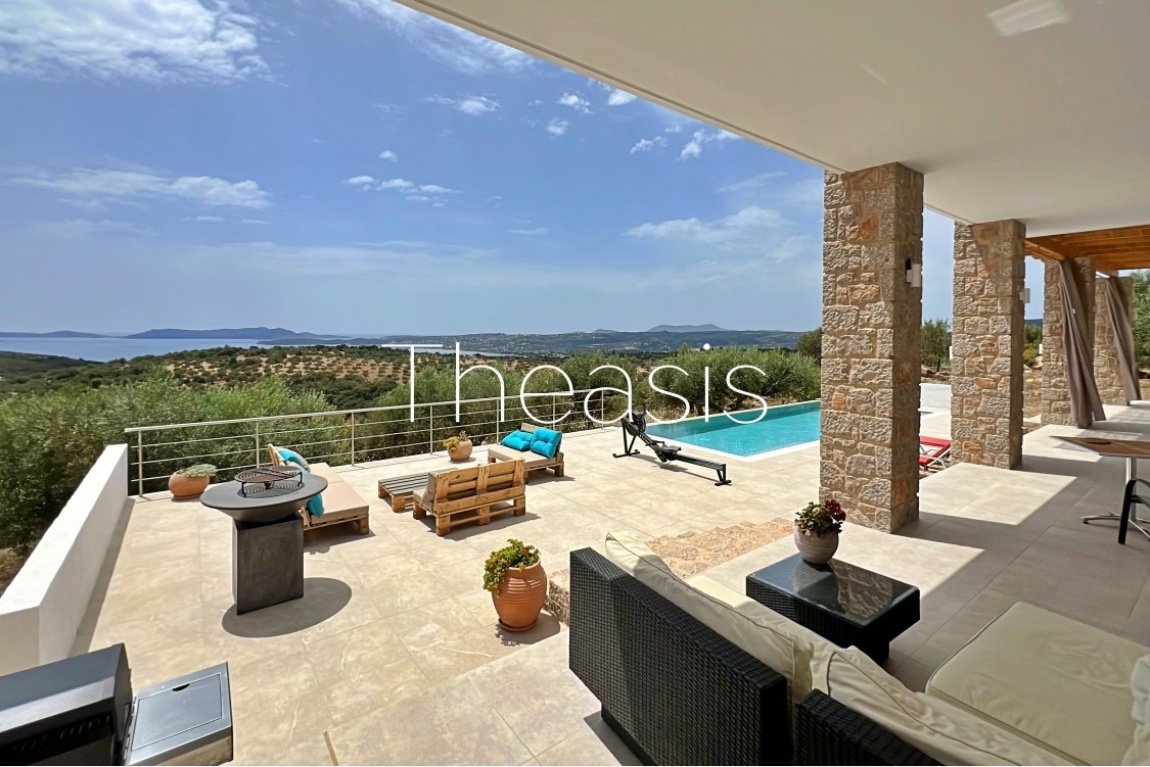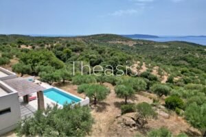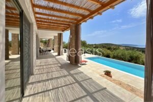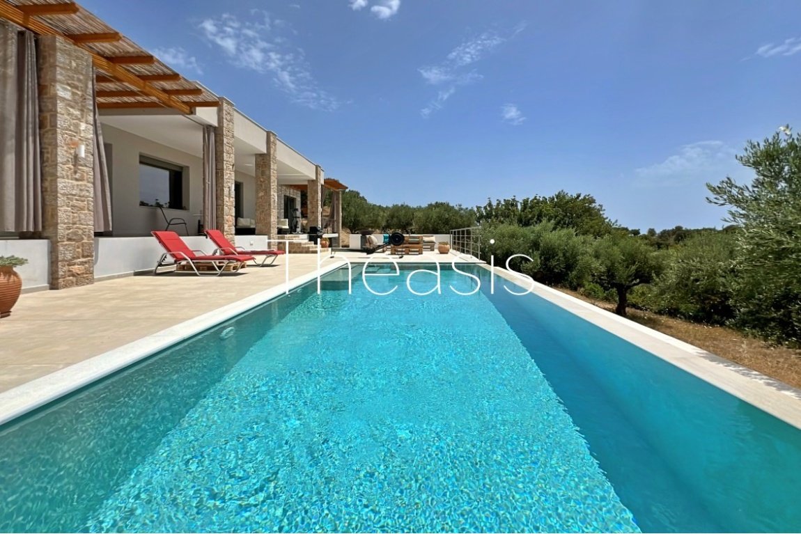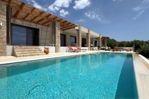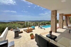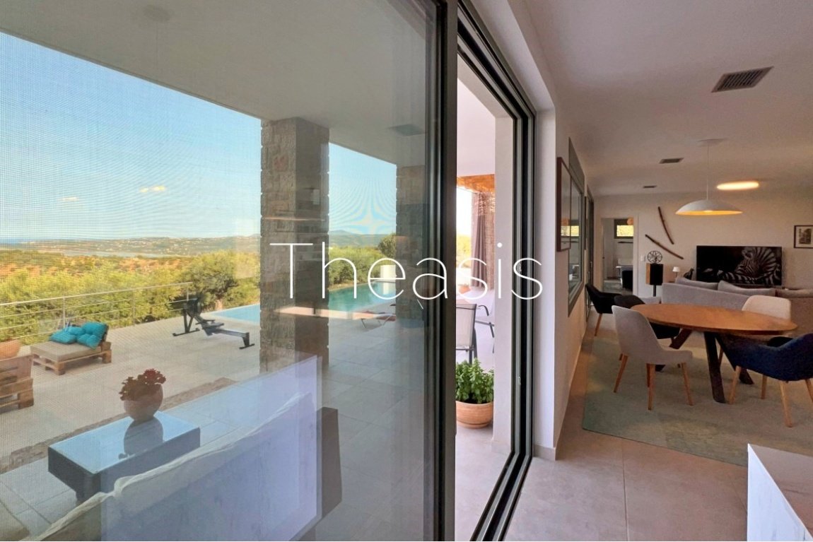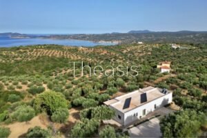 • Property Details: Newly built (2023) villa with stunning sunset, sea and island views, Hillside location in Akritochori – Finikounda area, Plot 5571.95 m² with olive trees, Modern design, Living area 162 m² (182 m² including the walls), 3 Bedrooms, 2 Bathrooms, Storage area, Swimming pool with infinity, Large terraces partly shaded, Easy access.