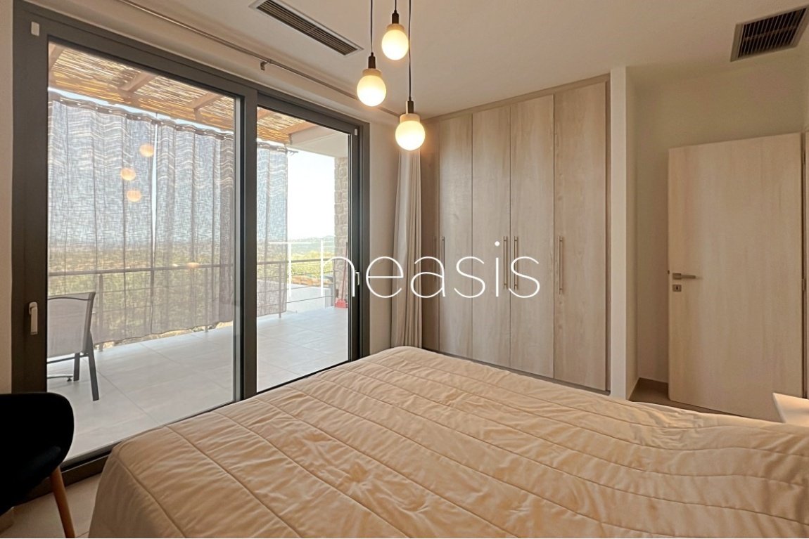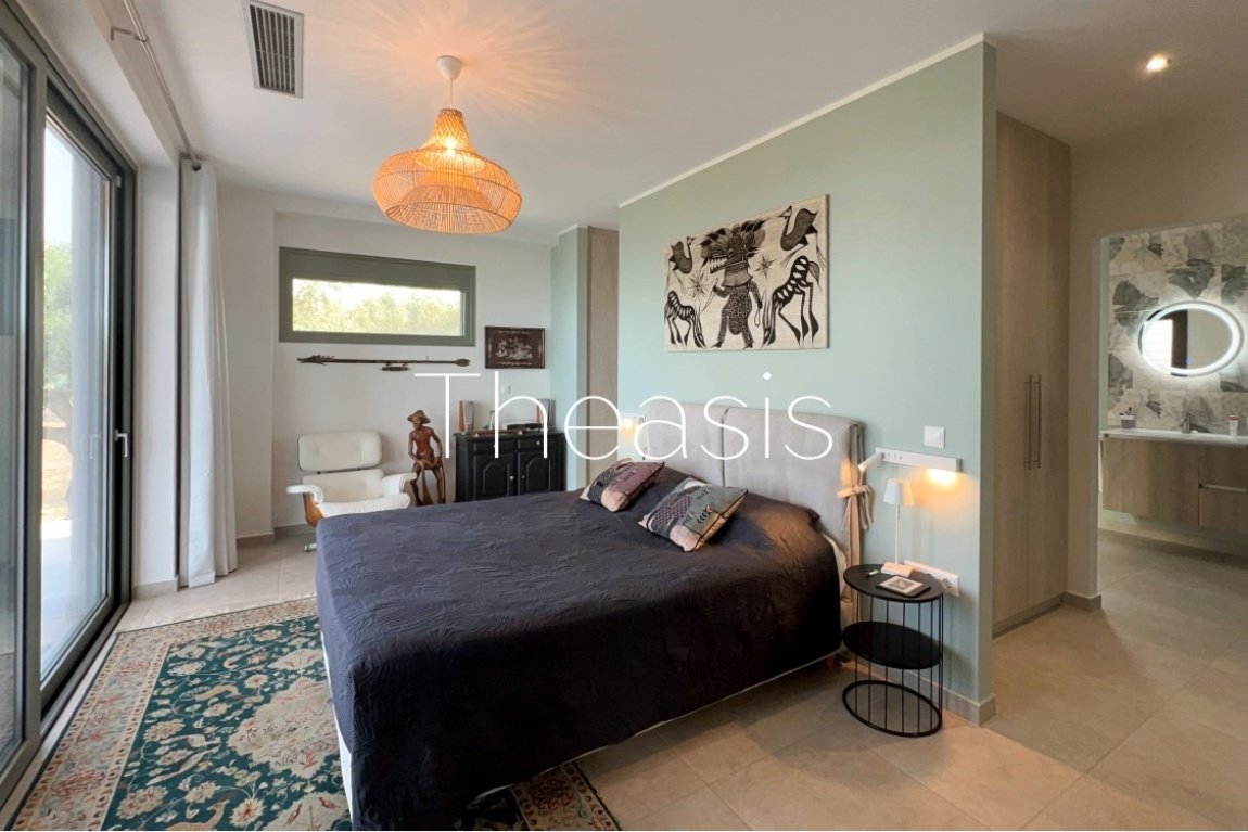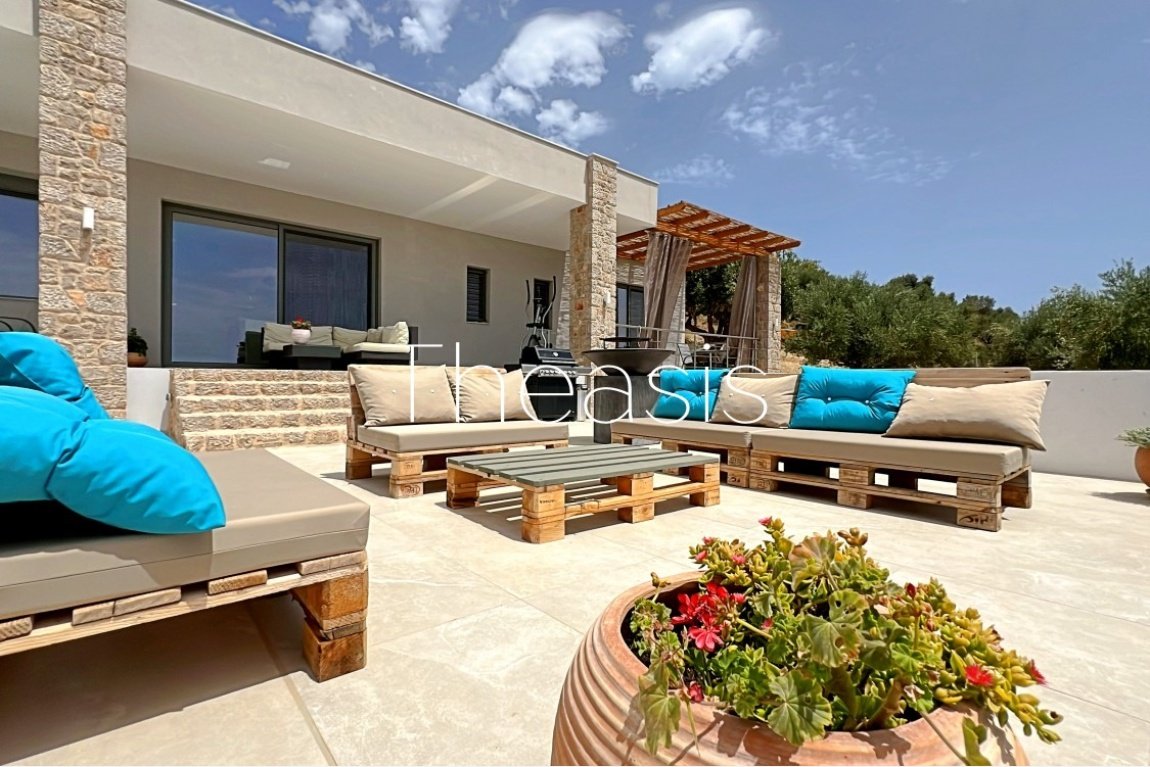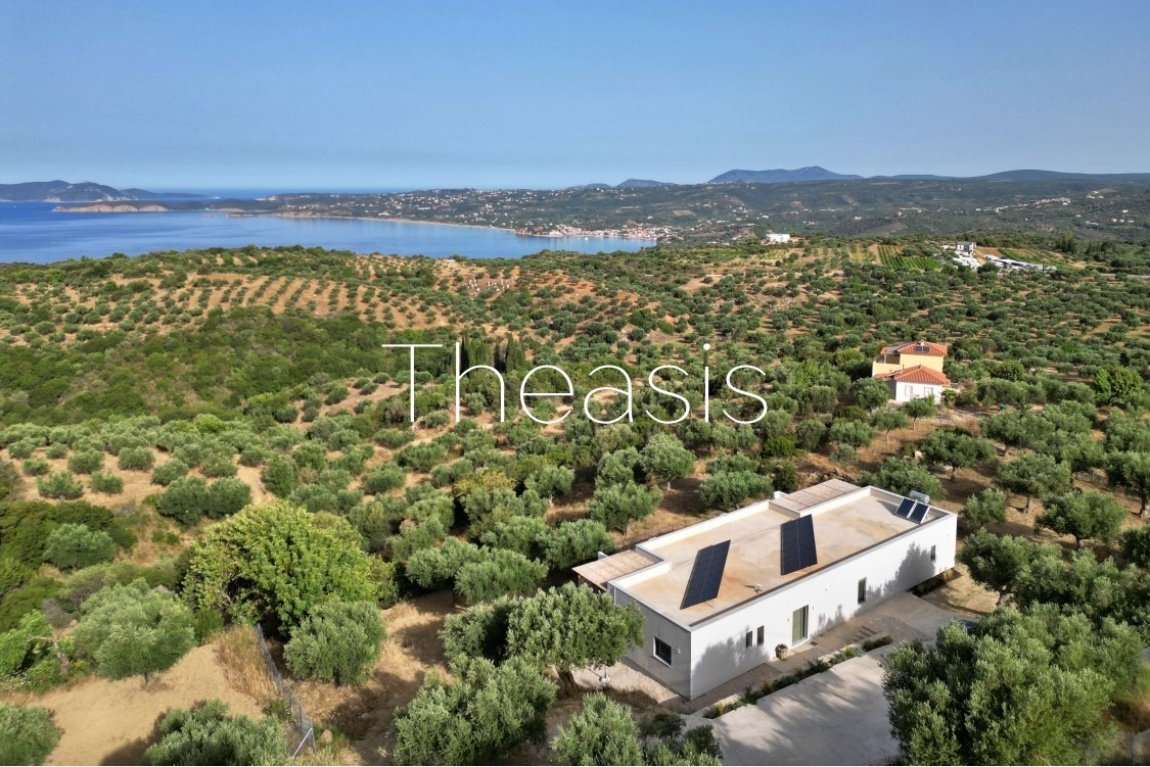 A house that emerges between the rocks and the olive trees to view the wonderful natural landscape, the curves of the green hills, the sea with the islands of Schiza, Agia Marina, Sapienza, the village of Finikounda with its beaches, and a wonderful sunset. A house designed in perfect harmony with the morphology of the landscape, invites you to enjoy full privacy, get relaxed in this unique natural environment and drive easily to the nearest sandy beach in less than 5 minutes.On a plot is of 5571.95 m², this single storey modern villa was built in the year 2023 with a total living area of 162 m² (182 m² including the walls). It consists of an open plan living room with fully equipped kitchen and utility room, master bedroom with en-suite bathroom, two bedrooms with shared bathroom and a guest toilet.