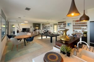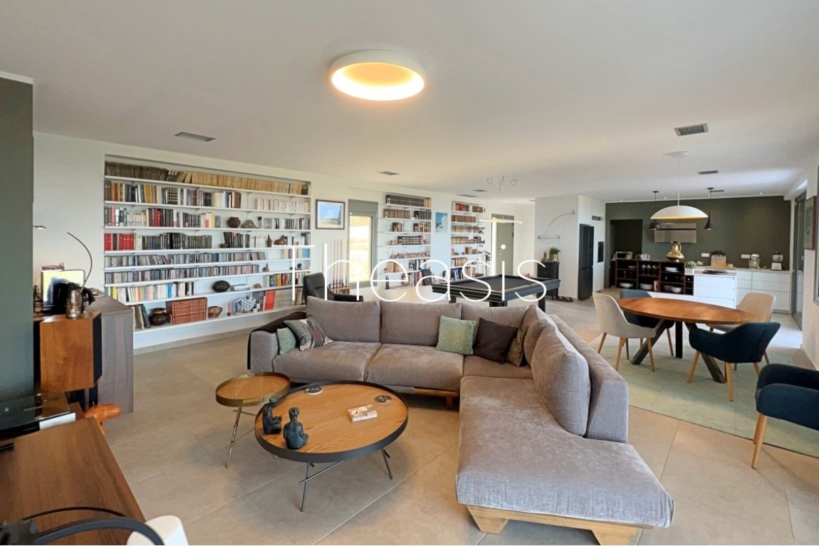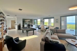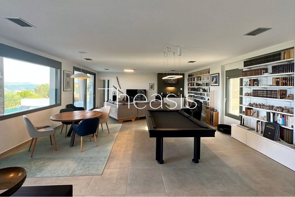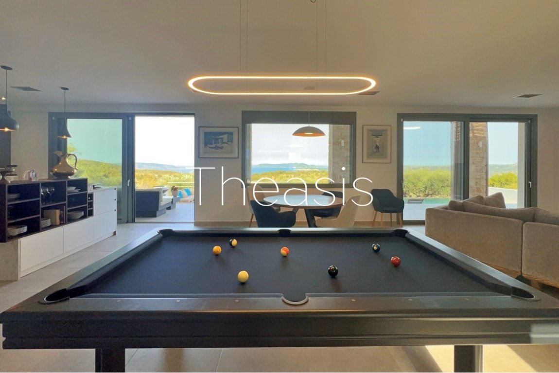 The open plan living room is a large symmetrical rectangle to make full and easy use of the space, to accommodate many things (bookshelf, billiard table, coffee maker desk & bar, lounge TV area, dining area) without looking full and busy. The kitchen area is specified by an island. It is modern, practical and fully equipped, while behind the kitchen there is a very useful utility room (food storage, washing machine, etc.). The extra wide patio doors and windows allow a view of the terrace and the sea and provide a seamless flow through indoor-outdoor living, a cohesive feel that’s open and airy.