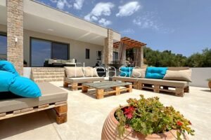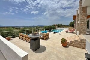 Two stone-built staircases are leading to the large pool terrace that accommodates the infinity swimming pool, the outdoor lounge and the sunbeds. The pool terrace enjoys the same magnificent views to the sea, the islands and the surroundings.