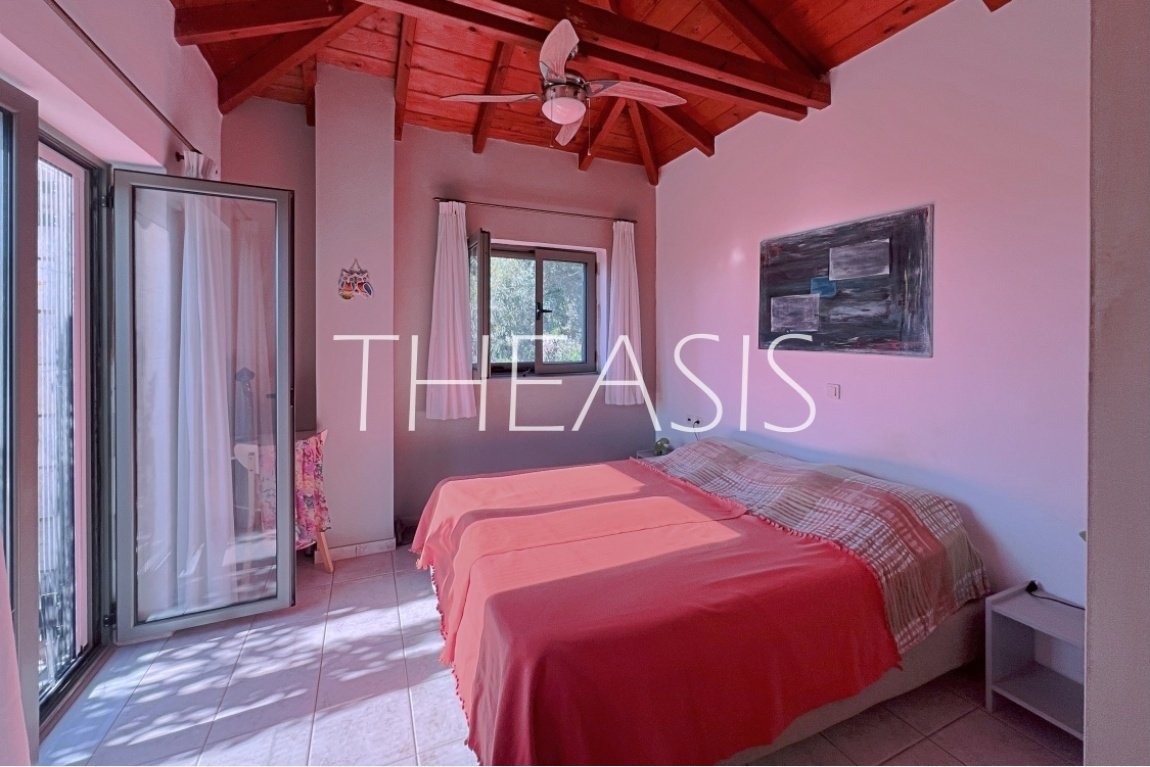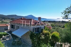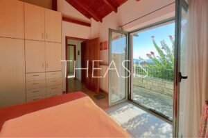 The upper floor (49.90 m²) is reached by an internal staircase and features two comfortable bedrooms sharing one bathroom. The beautiful wooden ceiling adds warmth and character. Both bedrooms open onto spacious balconies with wide, open views of Navarino Gulf. The upper floor also has access to a large paved terrace (above the ground-floor storage area), shaded from the strong summer sun, with a view of the garden — perfect for relaxation or outdoor activities.