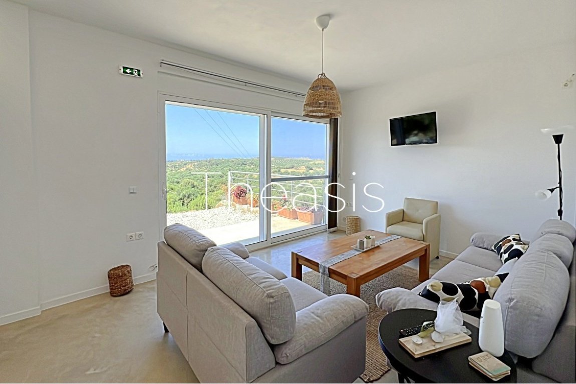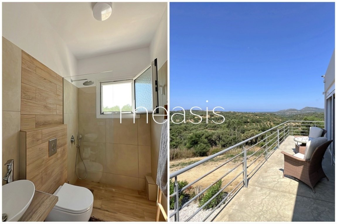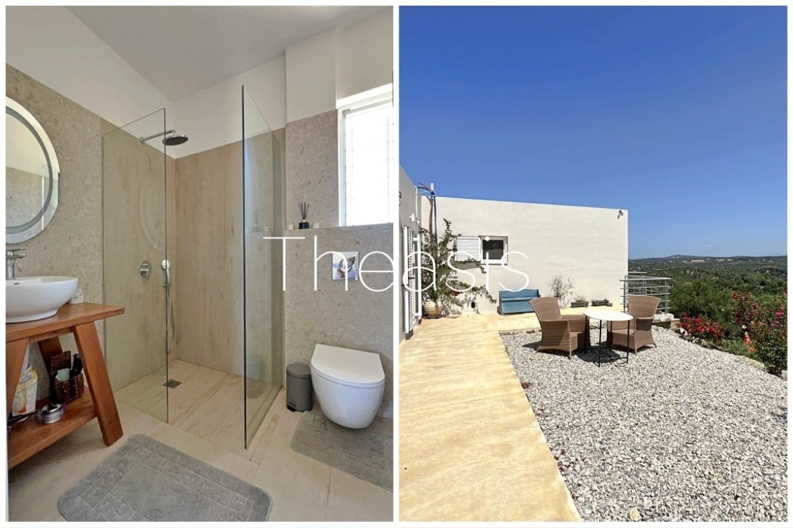 It is very difficult to find an available for sale property in direct contact with the protected forest environment. This brand-new modern villa has been built on a large plot of land measuring 6808 m² which, on one side it is very close to an asphalted road which means that the access is very easy, and on the other side it borders a forest area which means … absolute privacy. The large balconies and terraces overlook the sea and the wonderful valley dominated by wild vegetation and free wild birds. Due to the location of the property and the slope of the land, the view of the sea will remain unobstructed forever as will the beauty of the valley, which enjoys the absolute protection of the European Legislation about the areas of rare natural beauty - NATURA.