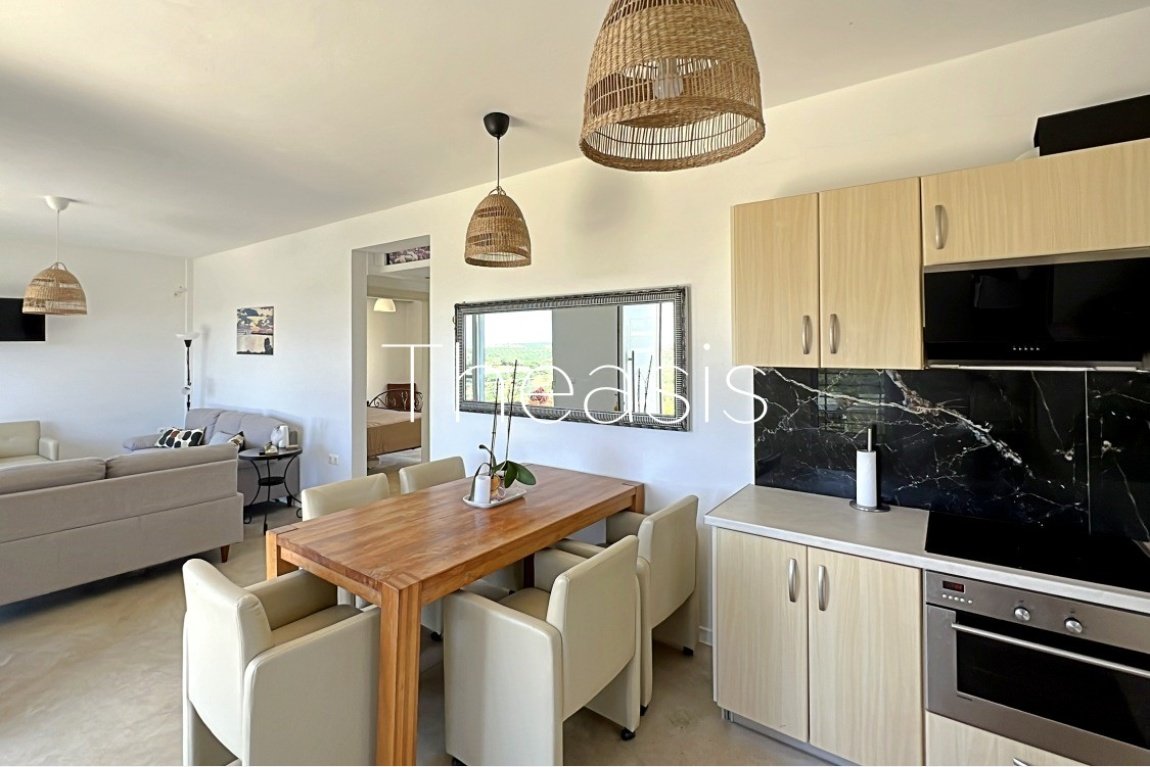 One apartment of the upper floor measures 69 m², consisting of an open plan sitting and dining area, with a fully equipped kitchen, 2 bedrooms and 1 bathroom with shower. From the living room and the kitchen, you can get out to the terrace and the front yard, which enjoy beautiful views to the sea, the mountains and the olive groves of the area. The bedrooms, equipped with wardrobes, have straight access to a terrace and the back yard.