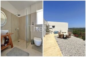 The second apartment of the upper floor measures 77 m² and consists of an open plan living room with dining area and an equipped kitchen, 2 bedrooms and 2 bathrooms with shower (one en-suite). The living room and the kitchen have access to a balcony and, via a staircase, to the front yard, while the bedrooms have their own balconies, with nice views to the olive groves and the mountains. The apartment is almost finished. The few remaining works will have been completed before the property is transferred to the new owner.