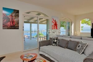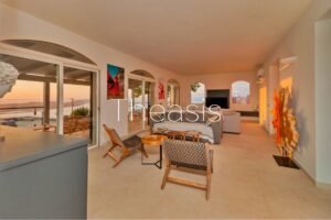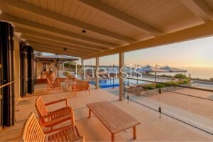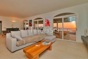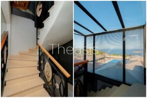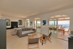 The middle floor, which is the main house, consists of 2 spacious living rooms connected via a super modern and minimal kitchen, 4 bedrooms with en-suite bathrooms and 1 guests’ bathroom. The living rooms lead to the spacious verandas which are finely furnished (heavy wooden dining tables and chairs) and enjoy magnificent sea and sunset views.