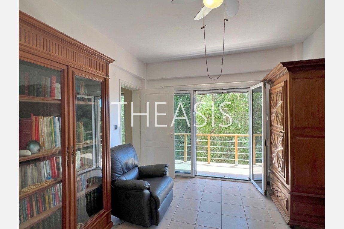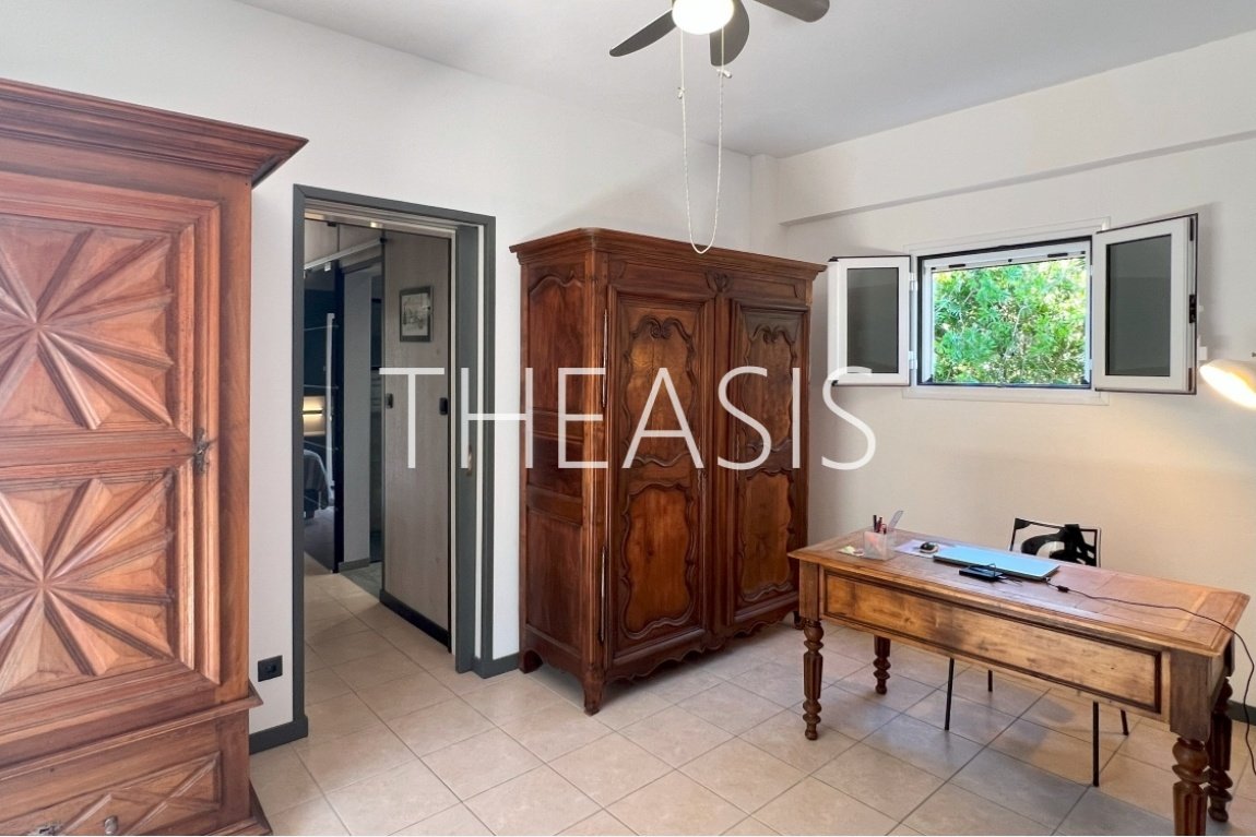 The middle floor accommodates 2 bedrooms with their en-suite bathrooms and another room, currently used as an office that could be converted into sleeping room or walk-in closet. The master bedroom has access to a large balcony with sea view while the balcony of the second bedroom enjoys views to the garden and the green surroundings.