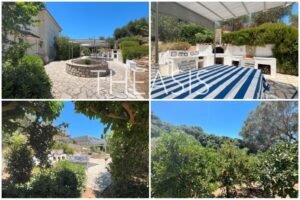 The garden is fully fenced and offers great privacy. It has an entrance gate, a driveway, and a shaded parking area. There is a small 18 m² stone garden house, perfect for storage. A lovely patio with a built-in BBQ and outdoor dining space makes it ideal for relaxing. The garden is full of olive and fruit trees, flowers and Mediterranean plants and herbs.